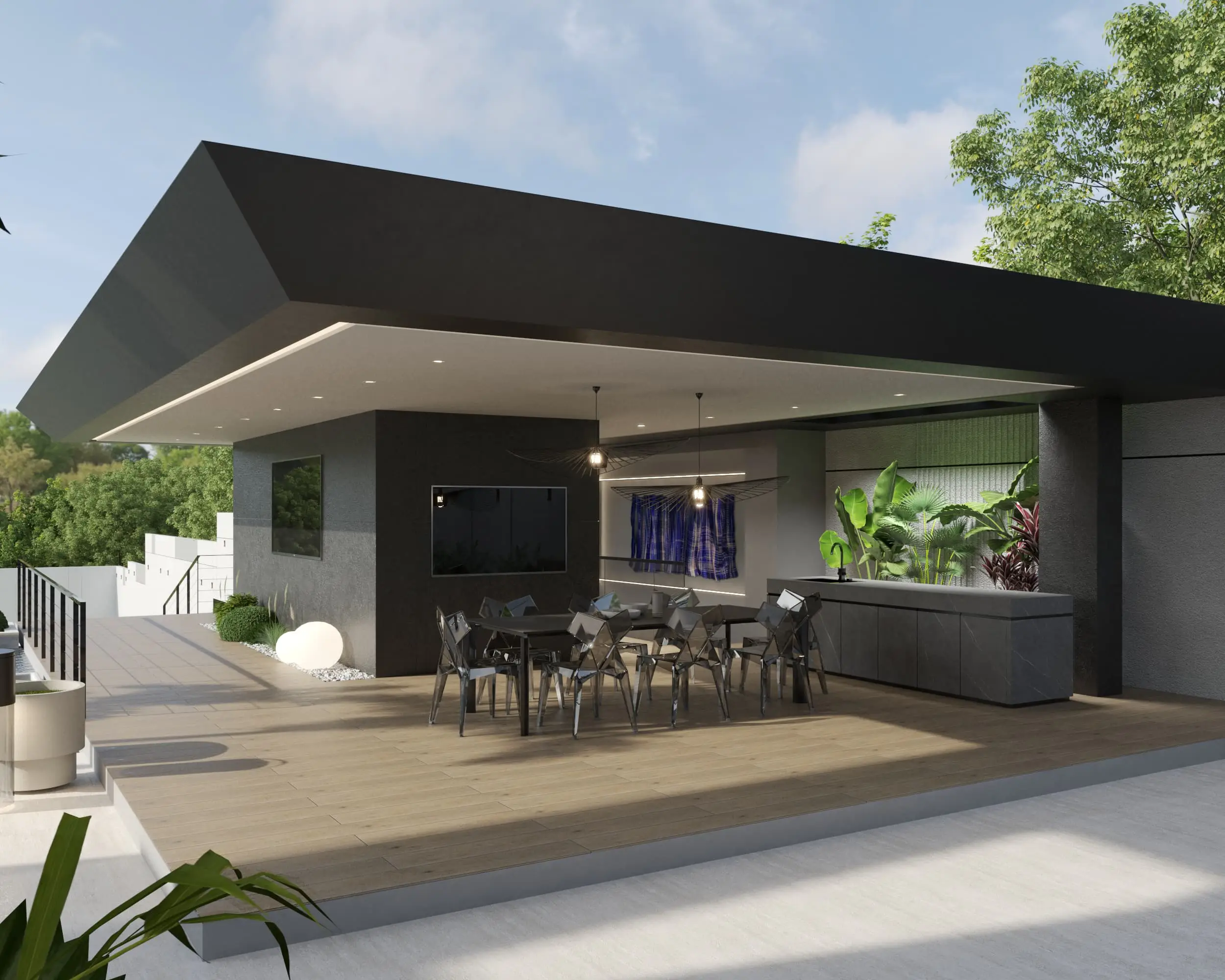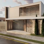 es un proyecto residencial de 1.026,71 m² que se implanta estratégicamente en forma de “L”, adaptándose a la topografía del terreno e integrándose de manera natural con el entorno exterior. La propuesta arquitectónica se define por una volumetría dinámica, construida a partir de ángulos, planos inclinados y grandes volados sostenidos por estructuras en “V”, que aportan carácter y jerarquía a la composición. La lectura espacial interna se organiza en torno a espacios interconectados que priorizan la apertura, la continuidad visual y la relación permanente entre interior y exterior.