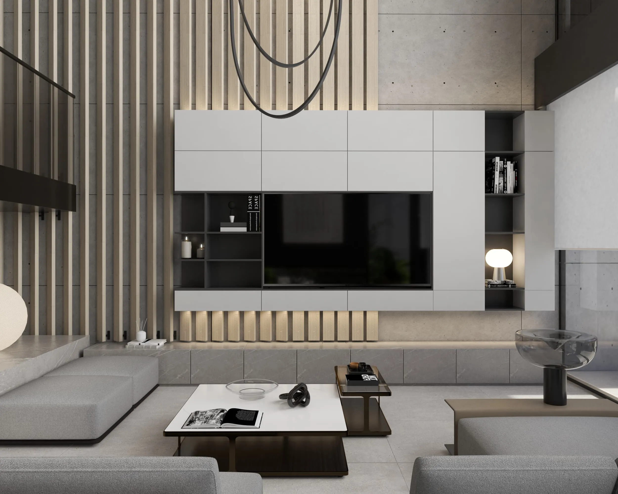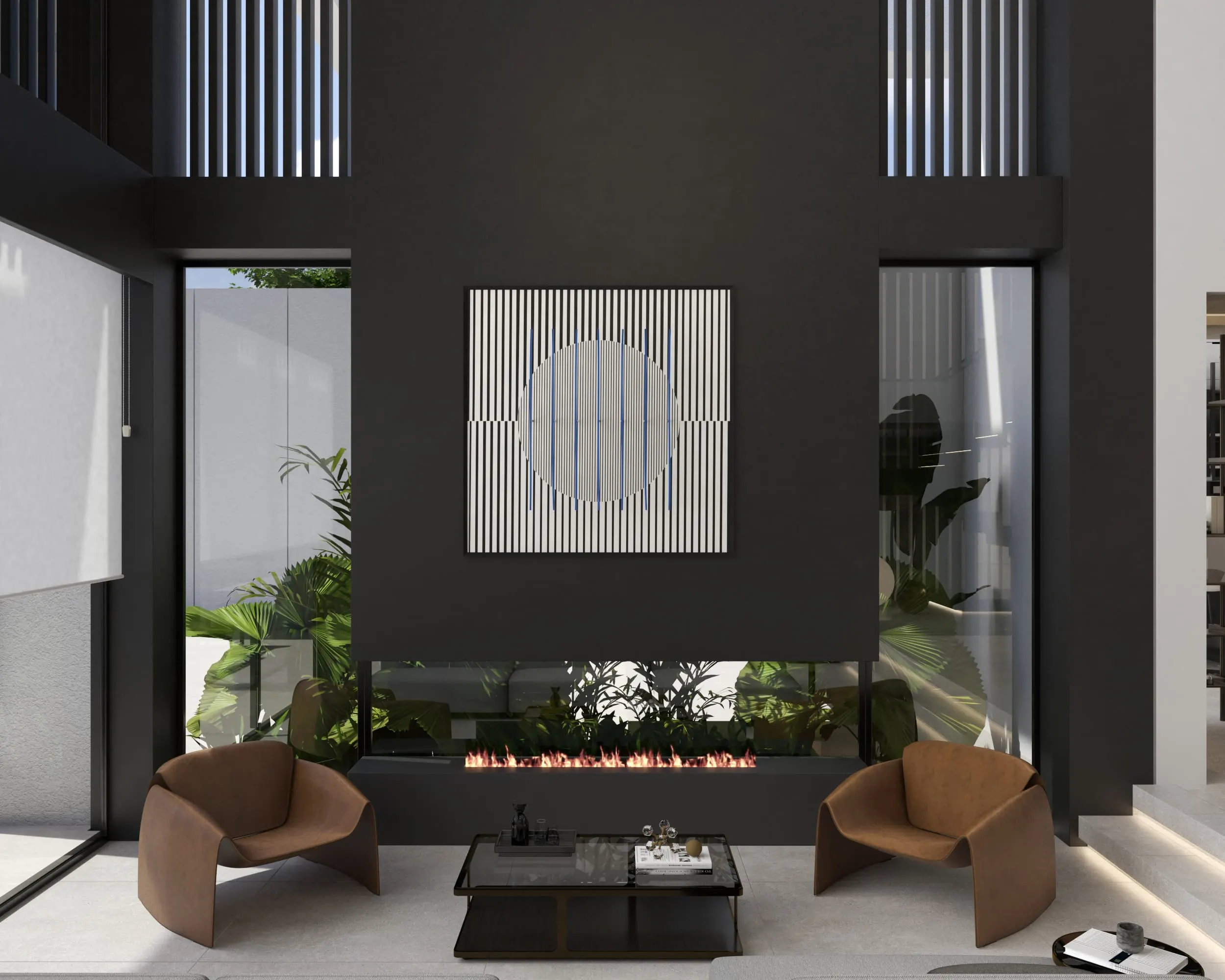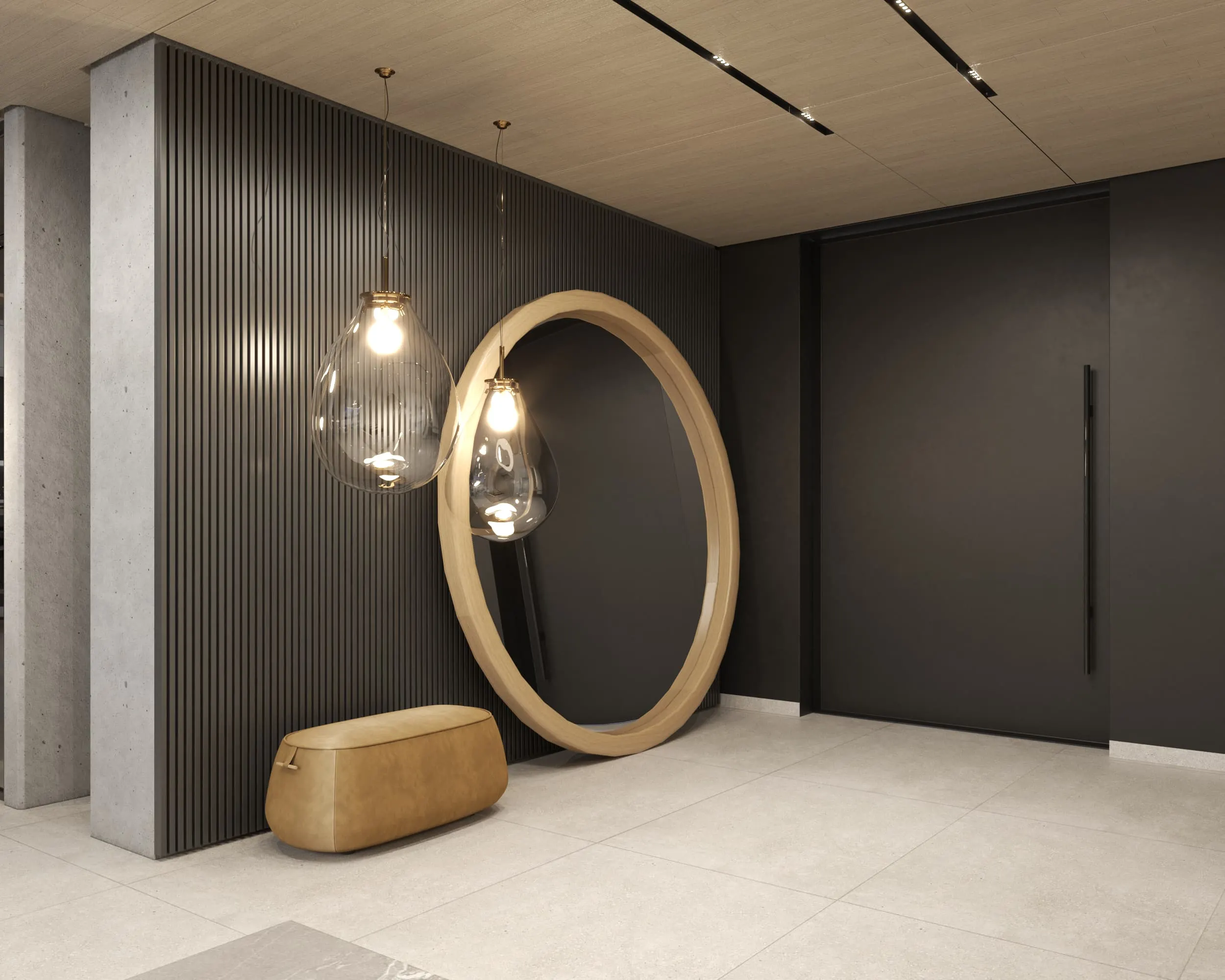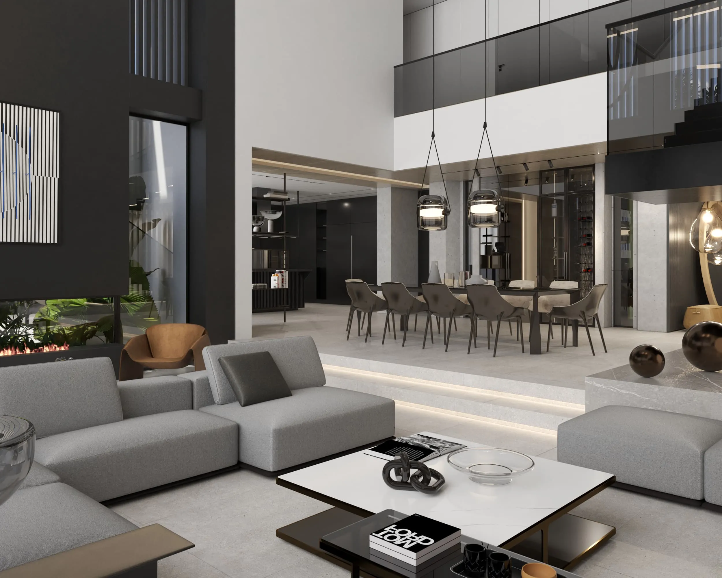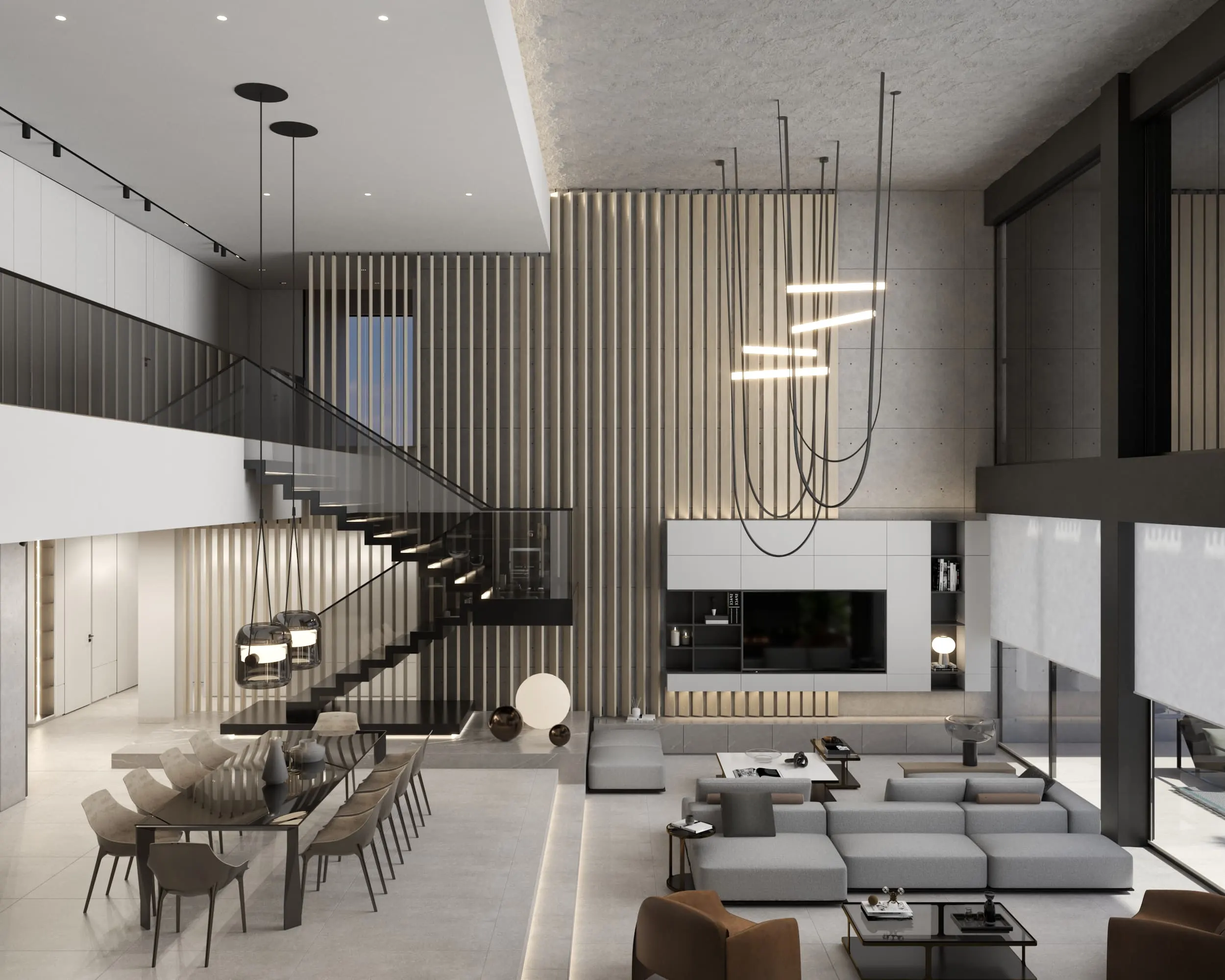 El diseño interior parte de un enfoque moderno y minimalista, donde los muros en obra limpia se convierten en protagonistas del lenguaje espacial. Las áreas sociales a doble altura y de concepto abierto permiten una lectura unificada de la casa, reforzada por un jardín interior y un espejo de agua ubicados en las zonas de permanencia. La paleta de materiales y colores fue cuidadosamente seleccionada para mantener coherencia entre ambientes: los tonos grises en distintas intensidades se combinan con la calidez de la madera natural, estableciendo un equilibrio entre sobriedad, funcionalidad y sofisticación. Cada espacio responde a un mismo lenguaje estético, buscando armonía sin renunciar a la expresión.