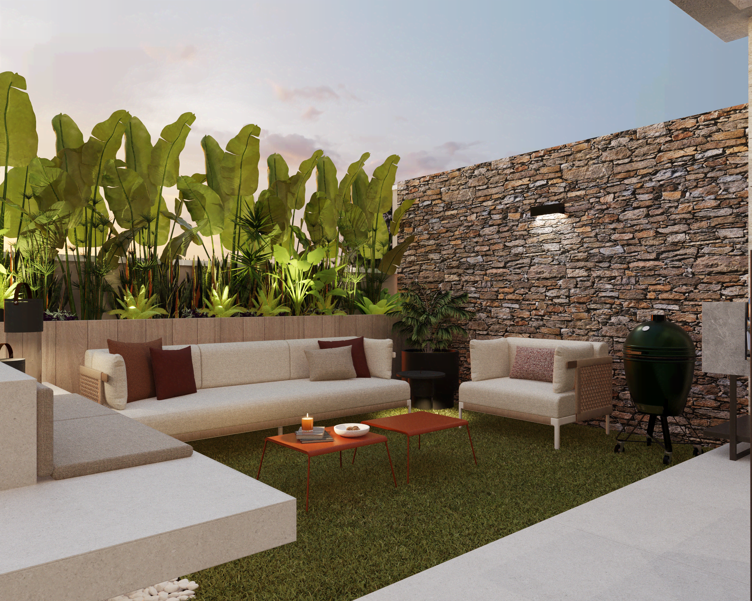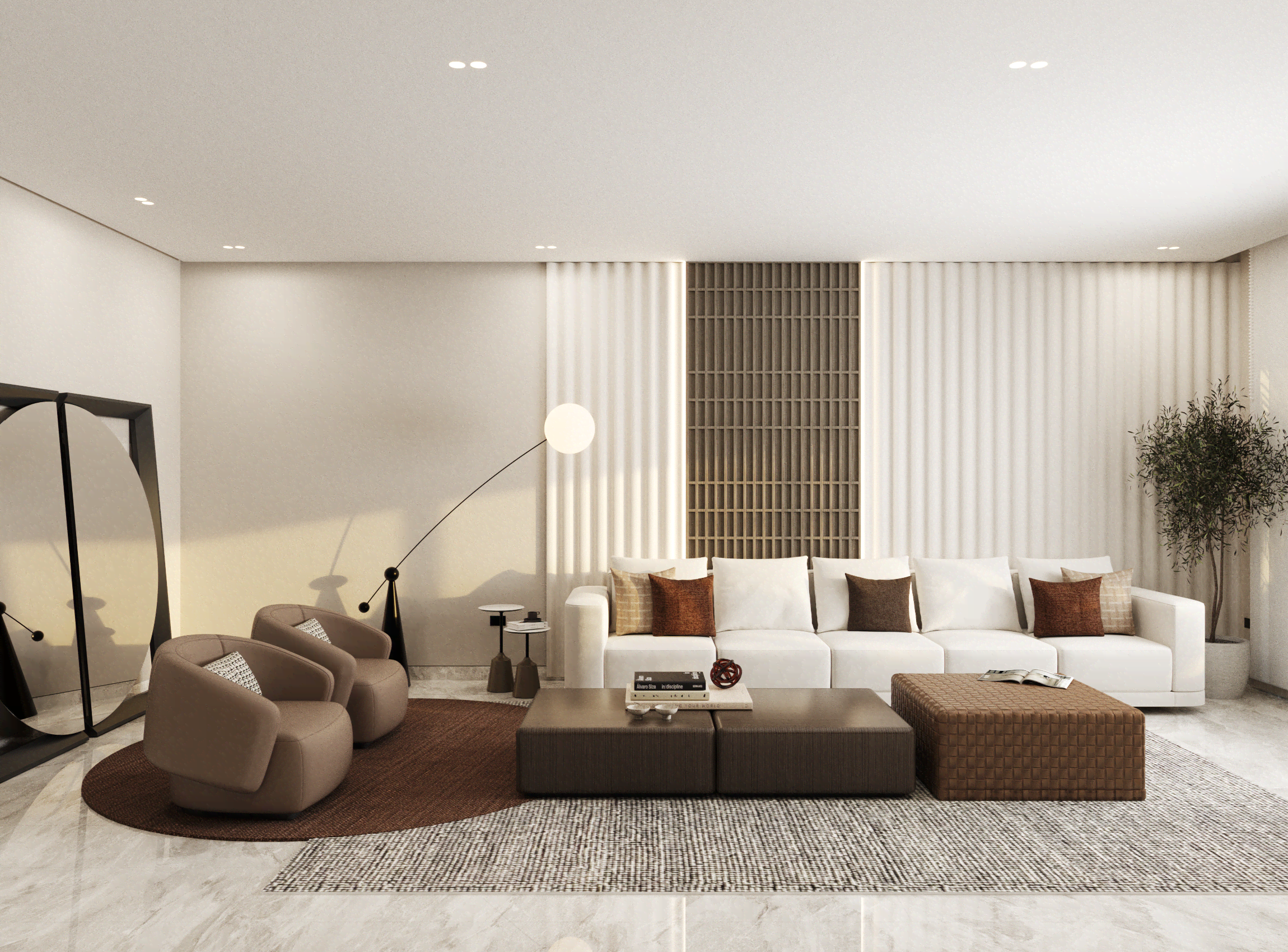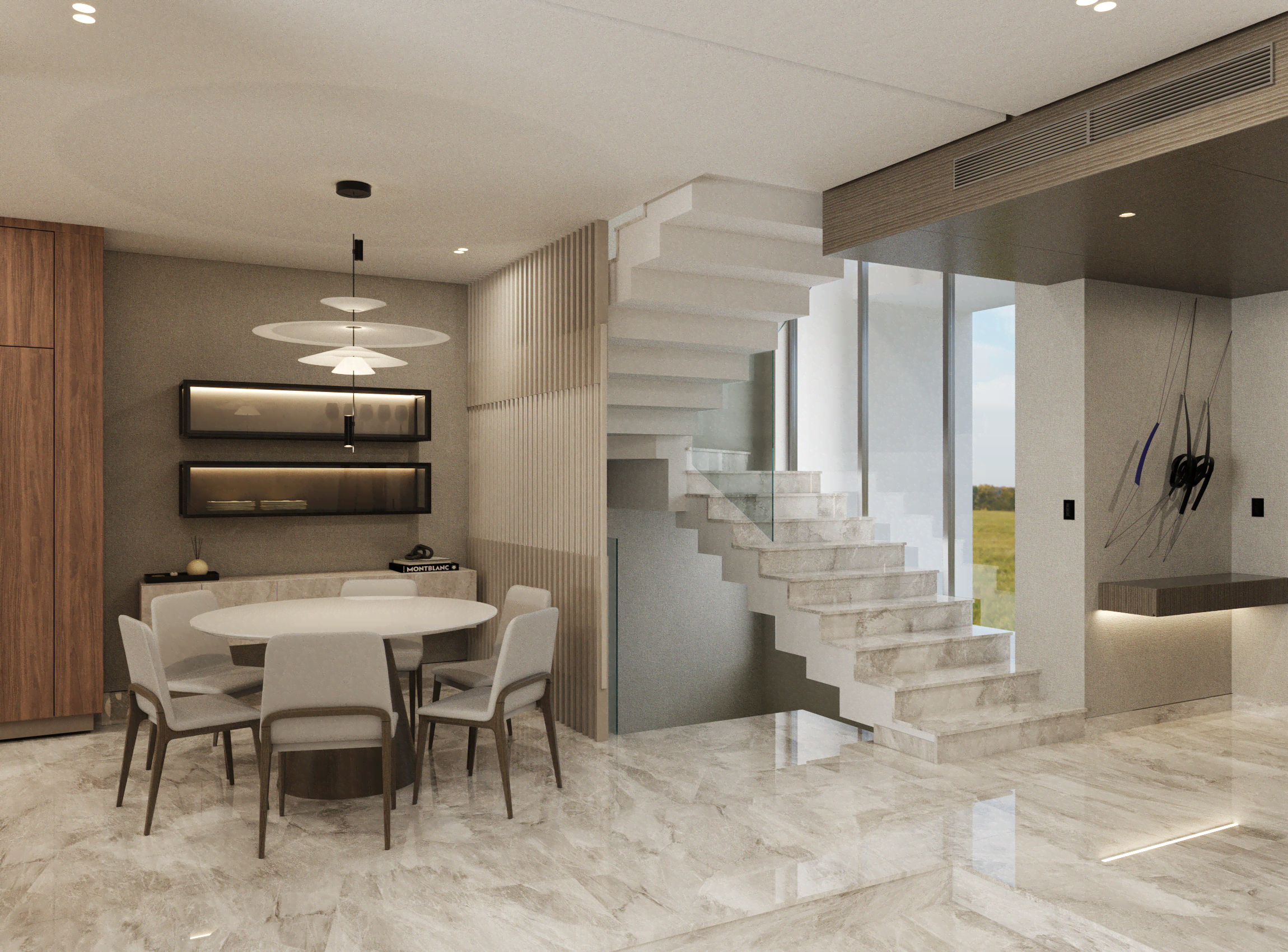 La propuesta de diseño fusiona influencias del estilo nórdico con acentos contemporáneos, generando una narrativa espacial coherente y elegante. Se seleccionó una paleta de materiales cuidadosamente curada, donde la madera natural, la piedra y los laminados en tonos taupe claro actúan como elementos unificadores. Los acentos en terracota funcionan como contrapunto cromático, aportando calidez visual y carácter. Esta materialidad se replicó en todas las áreas intervenidas —hall, sala, comedor, terraza exterior, family room, habitaciones infantiles, habitación principal y sótano— garantizando continuidad formal y armonía sensorial en todo el recorrido doméstico.
