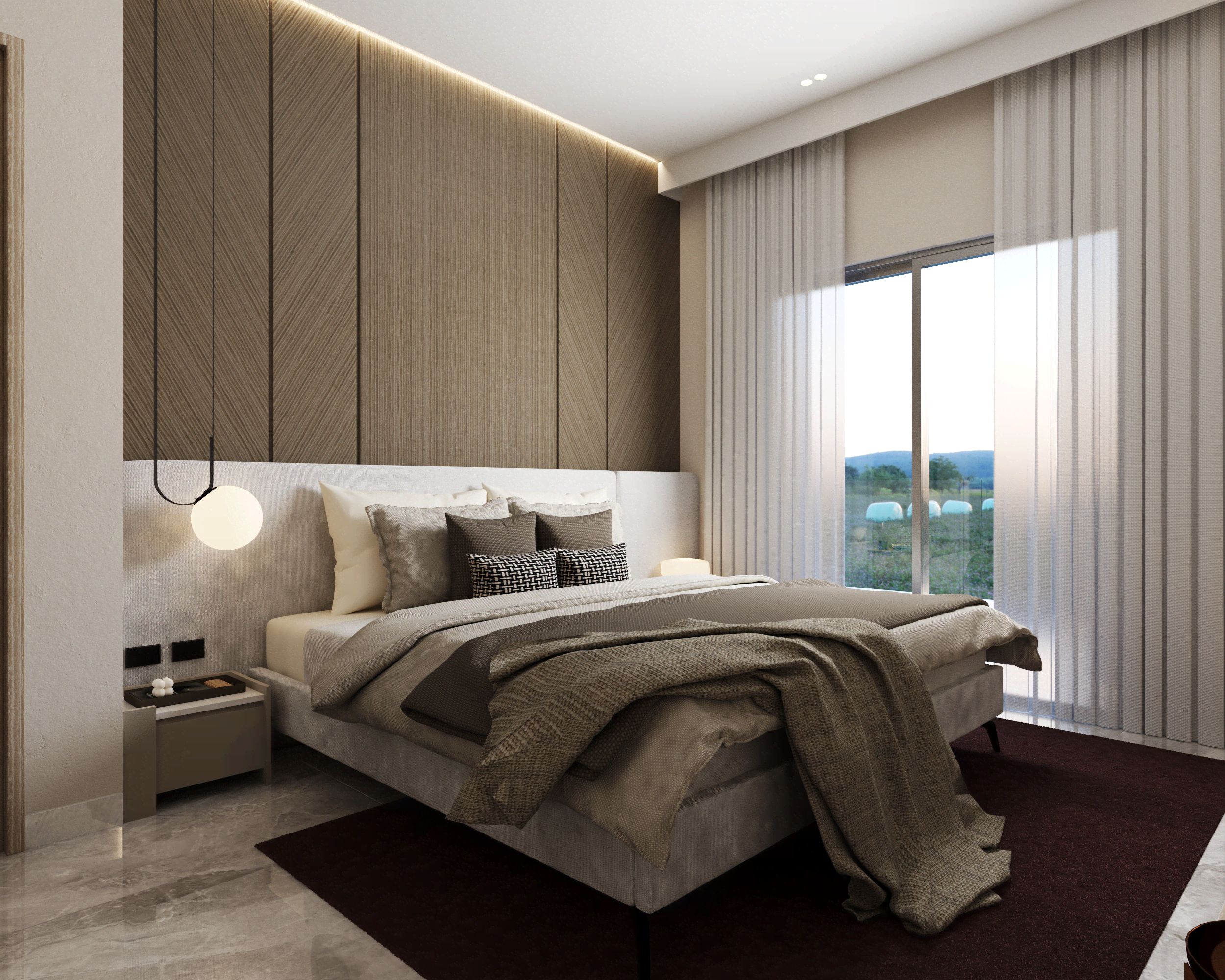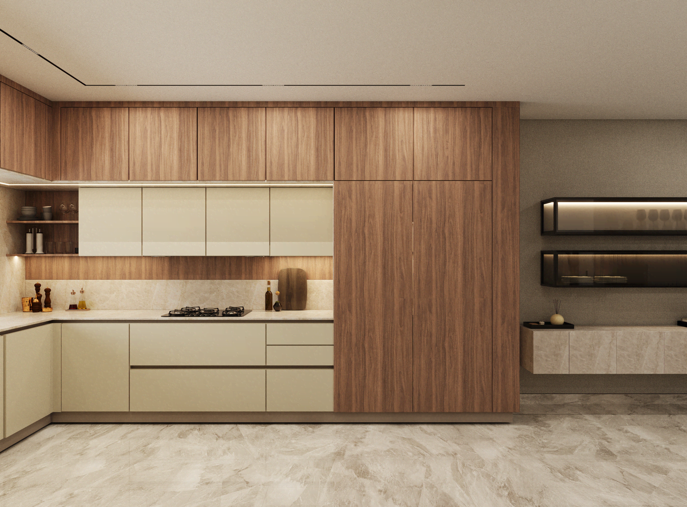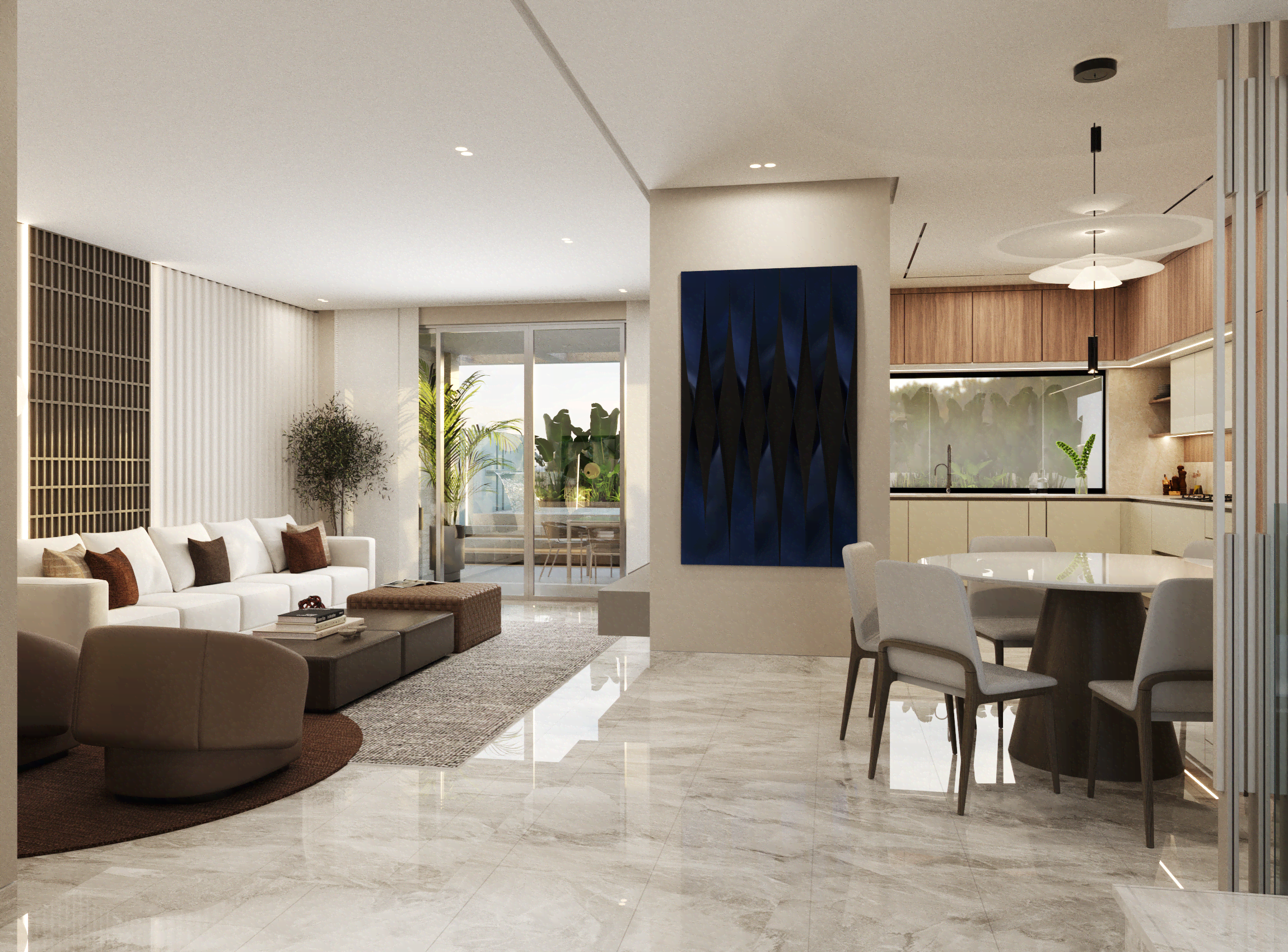 La propuesta de diseño fusiona influencias del estilo nórdico con acentos contemporáneos, generando una narrativa espacial coherente y elegante. Se seleccionó una paleta de materiales cuidadosamente curada, donde la madera natural, la piedra y los laminados en tonos taupe claro actúan como elementos unificadores. Los acentos en terracota funcionan como contrapunto cromático, aportando calidez visual y carácter. Esta materialidad se replicó en todas las áreas intervenidas —hall, sala, comedor, terraza exterior, family room, habitaciones infantiles, habitación principal y sótano— garantizando continuidad formal y armonía sensorial en todo el recorrido doméstico.