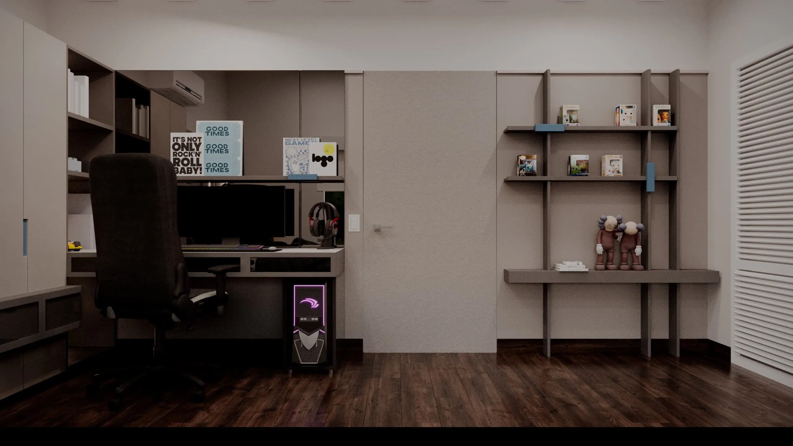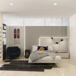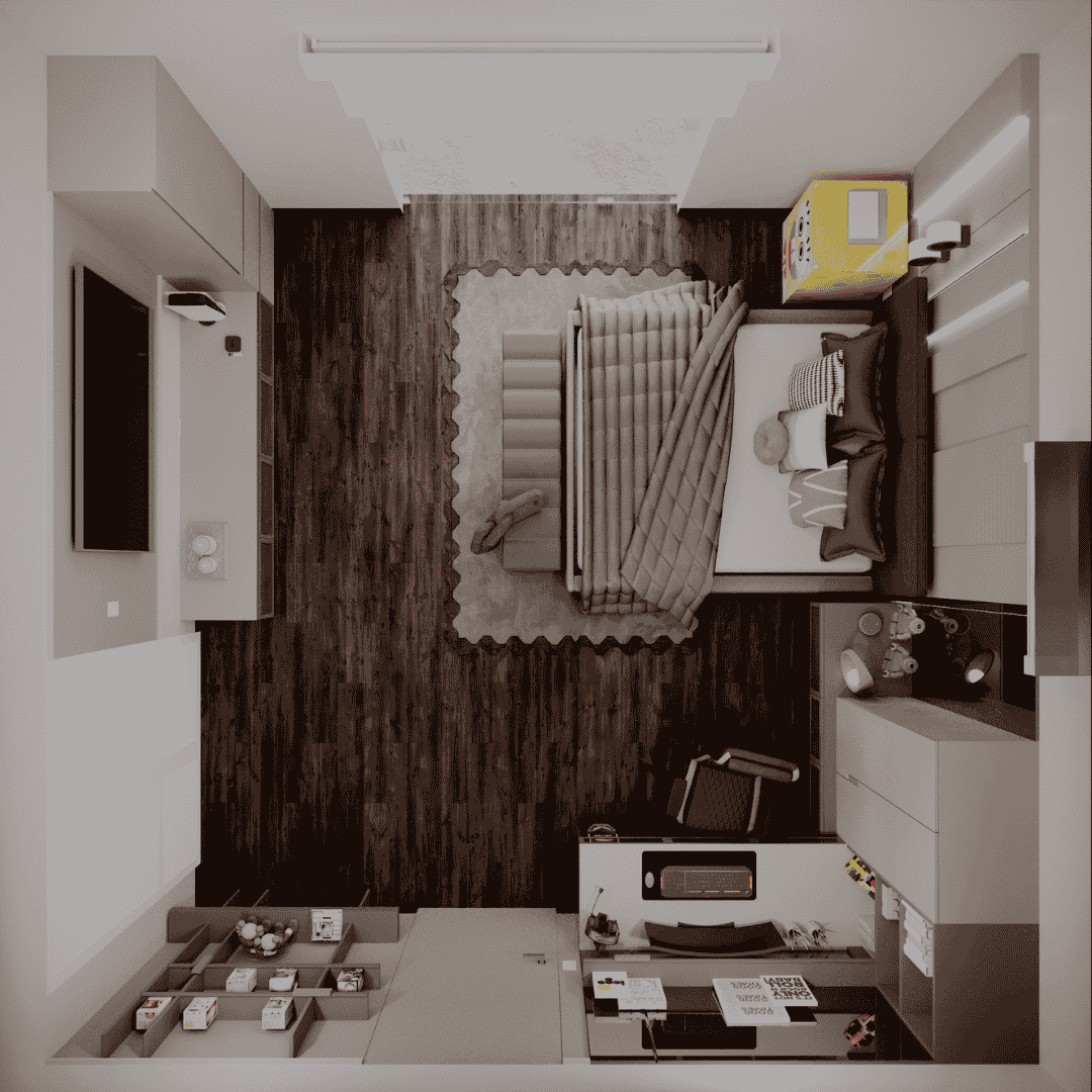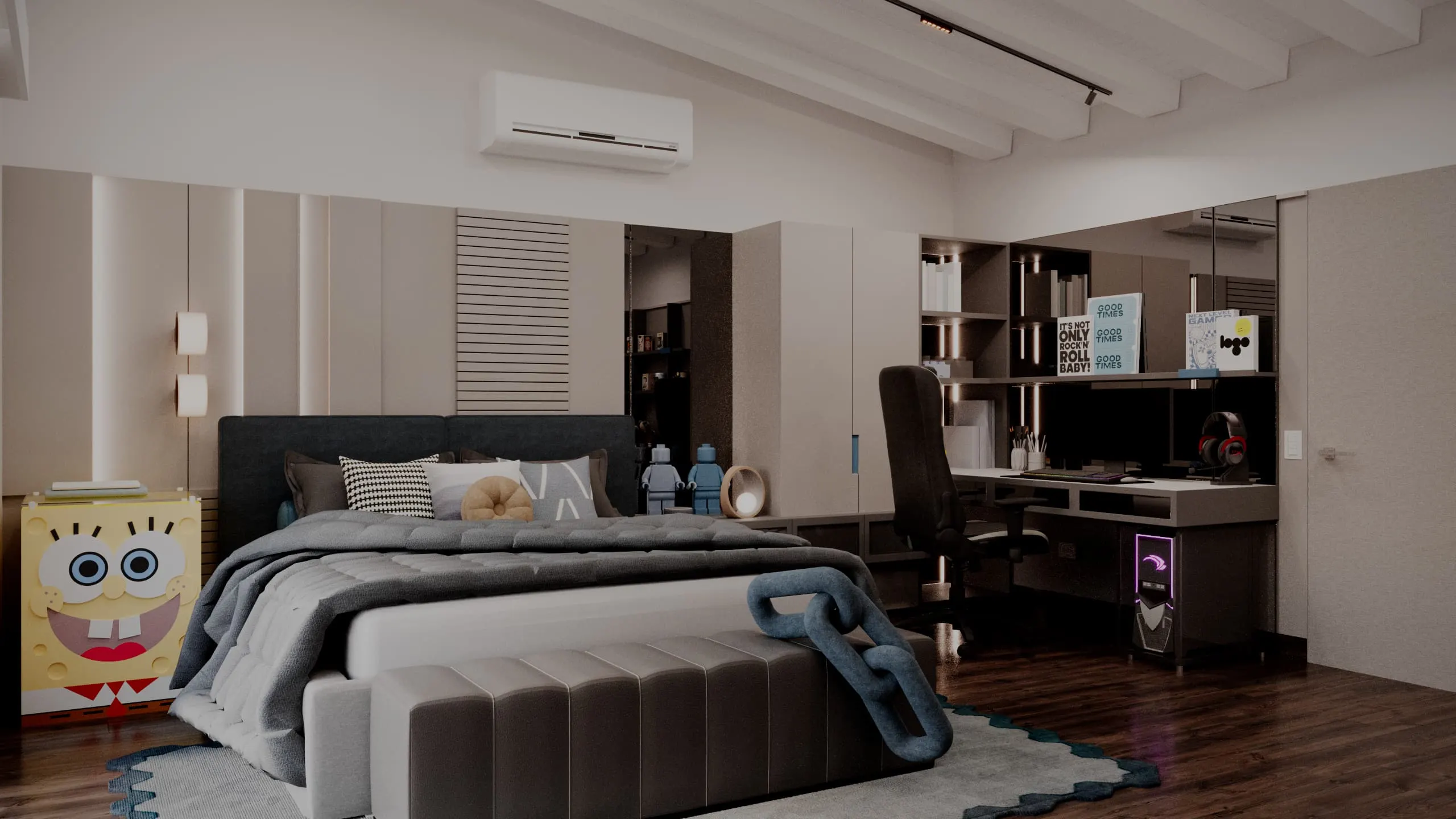 En HabSM diseñamos una habitación de estilo moderno y atemporal, pensada para acompañar una etapa muy especial: el crecimiento hacia la adolescencia y la adultez. La distribución del espacio se organizó integrando de forma equilibrada áreas de descanso, exhibición personal y una zona tecnológica para gaming y estudio, logrando un ambiente funcional, cómodo y con una estética sobria que podrá evolucionar con el tiempo.