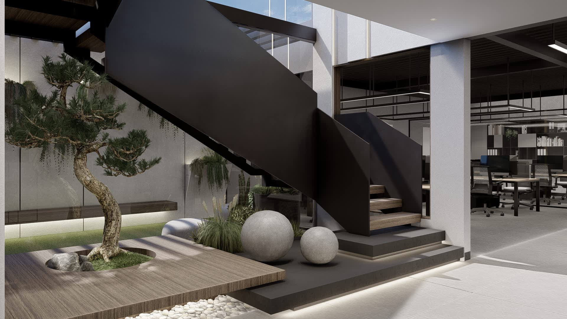 El diseño se apoya en una paleta neutra de grises, materiales expuestos y texturas sobrias que definen una atmósfera profesional, sin perder calidez. Se priorizó el ingreso de luz natural como recurso de bienestar y eficiencia energética, complementado por un esquema de iluminación artificial cuidadosamente articulado. Las áreas de trabajo se organizan de forma fluida, con transiciones sutiles entre zonas colaborativas, operativas y privadas, generando un entorno flexible que fomenta la innovación y el sentido de comunidad laboral. El mobiliario, las circulaciones y las visuales fueron dispuestos estratégicamente para impulsar tanto el enfoque individual como la interacción entre equipos.